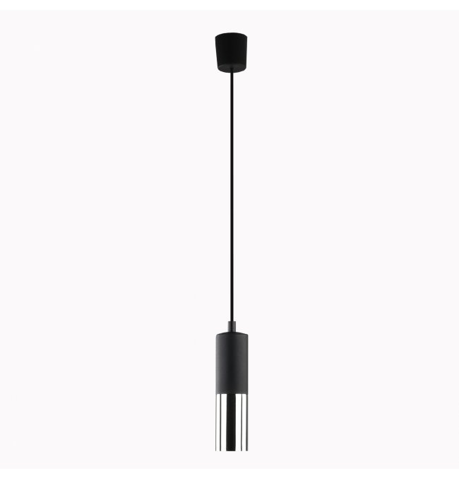 Lampa wisząca ELIT przyciąga uwagę smukłą, cylindryczną formą tuby, której dolna część pokryta jest pionowymi chromowanymi paskami na czarnym tle. To połączenie matowej czerni i srebrnego połysku nadaje lampie nowoczesny, industrialny charakter. Zawieszona na cienkim czarnym przewodzie z dopasowanym podsufitką tworzy spójną, minimalistyczną całość. Oświetlenie wiszące z serii ELIT od TK Lighting wpisuje się w estetykę współczesnych wnętrz.
