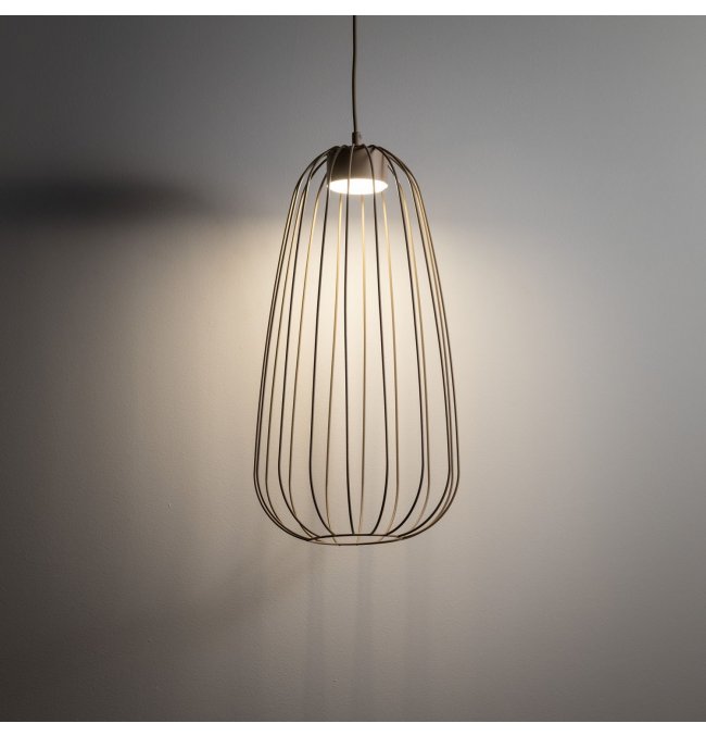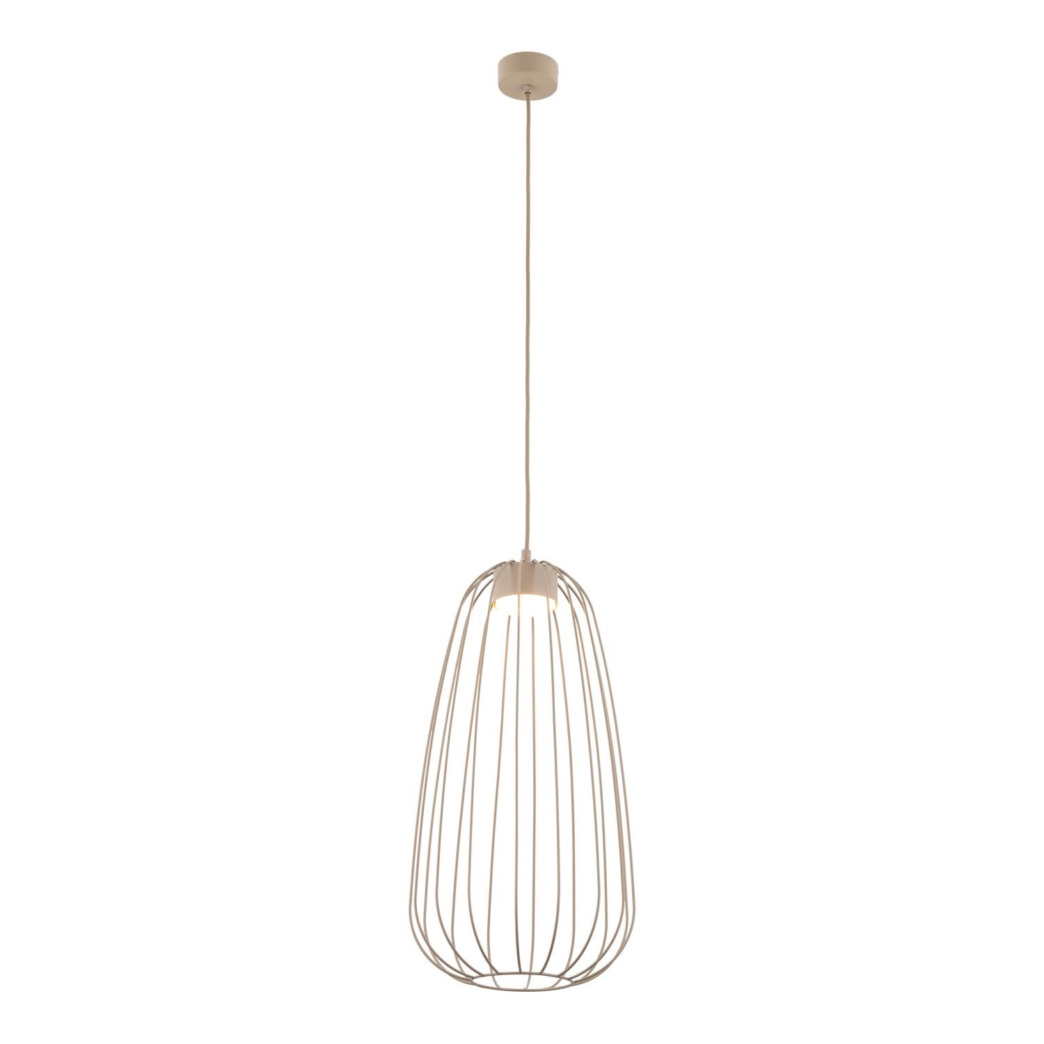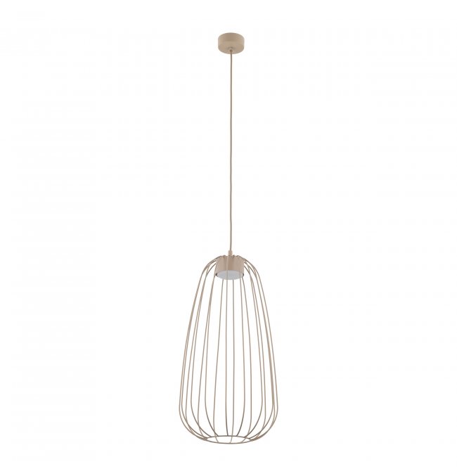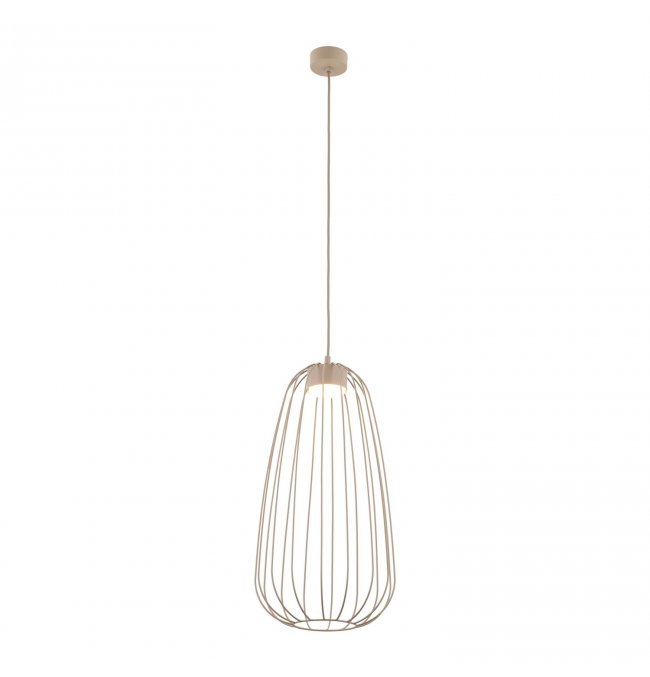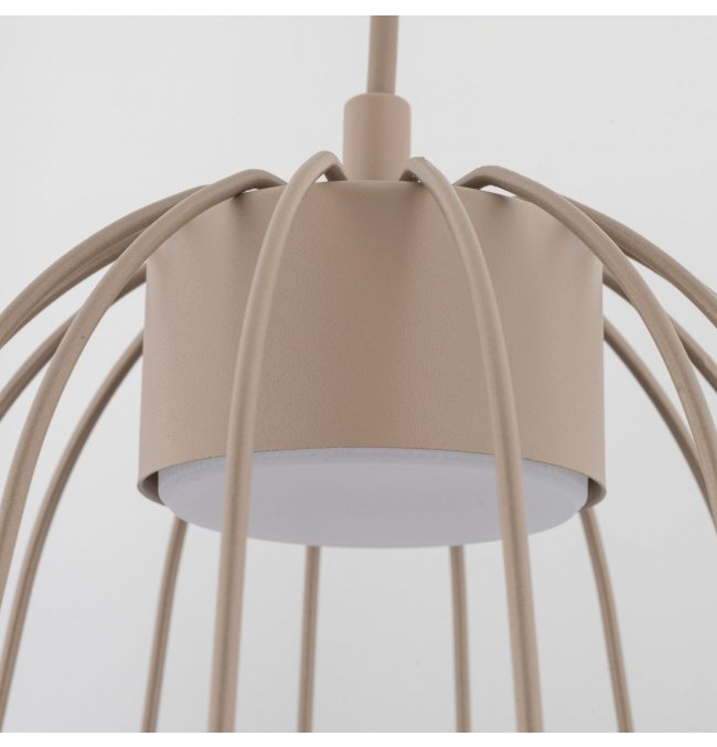 Lampa wisząca SPHERA S w kolorze beżowym sabia przyciąga uwagę druciany kloszem w kształcie wydłużonej łzy. Stalowa klatka wykonana z lakierowanej stali tworzy ażurową bryłę, przez którą światło swobodnie przechodzi na wszystkie strony. Seria SPHERA od TK Lighting łączy styl loft z nowoczesną, minimalistyczną formą — bez zbędnych ornamentów.