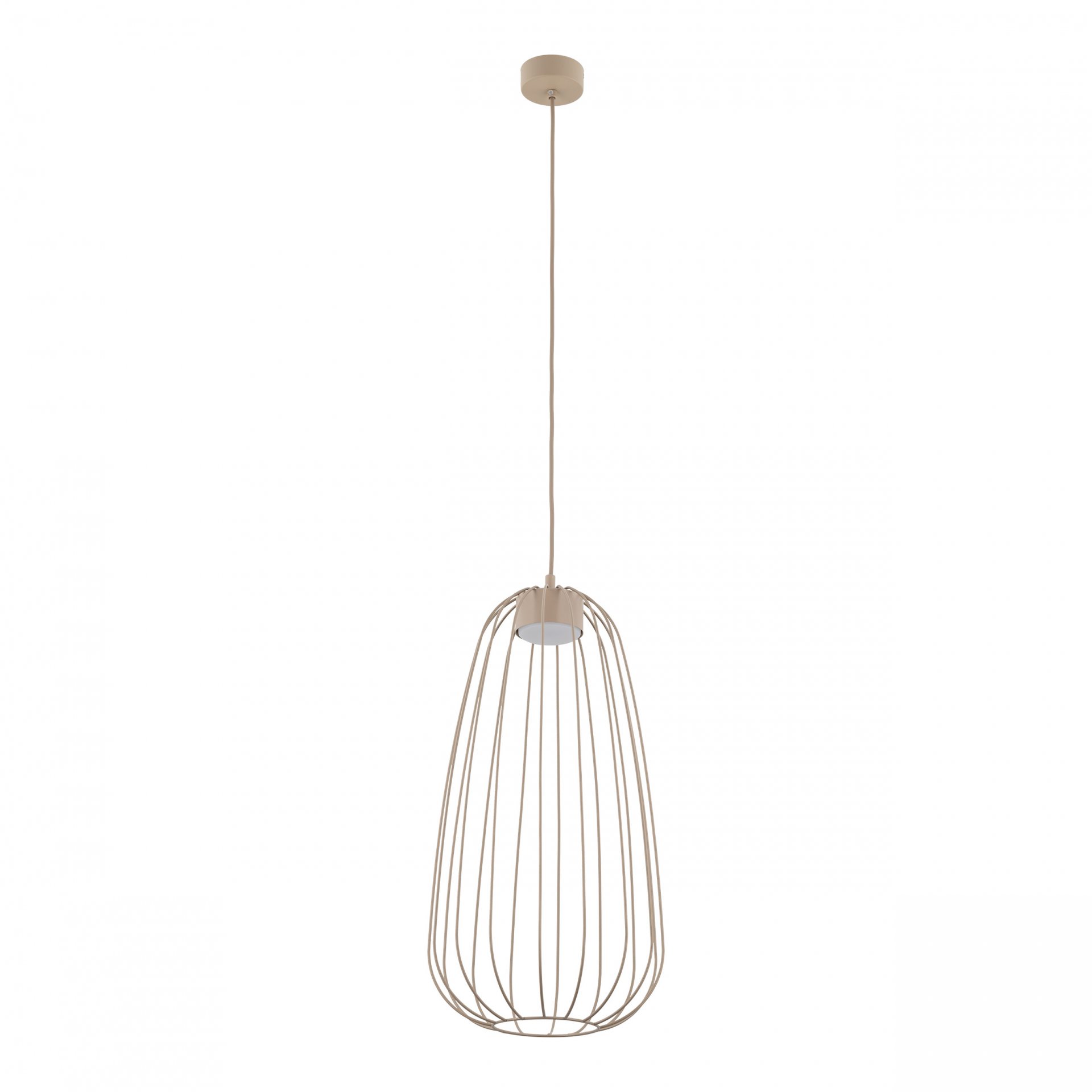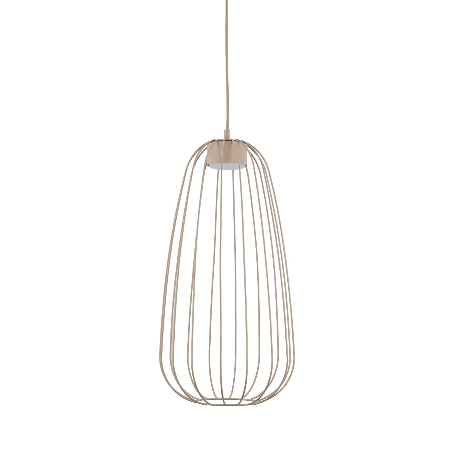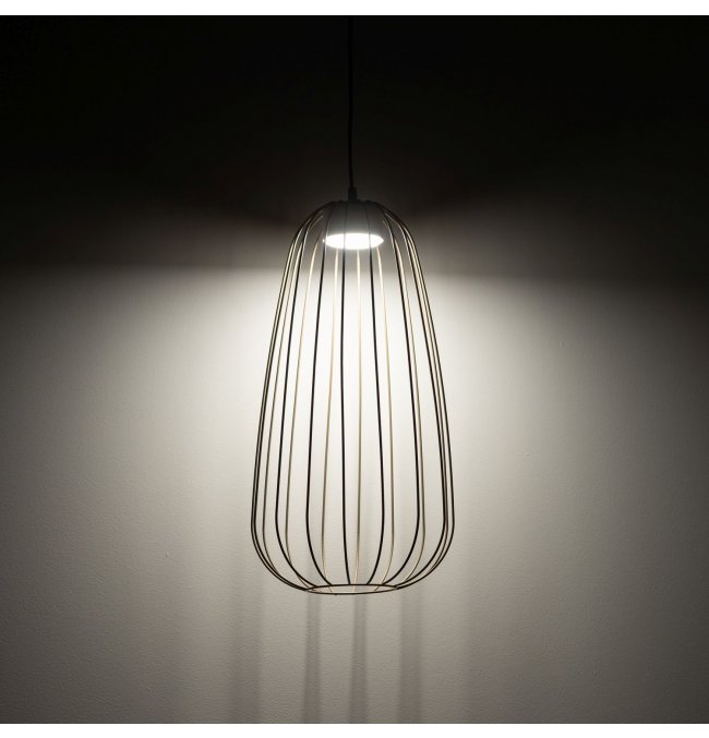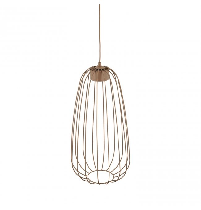 Lampa wisząca SPHERA S w kolorze beżowym sabia przyciąga uwagę druciany kloszem w kształcie wydłużonej łzy. Stalowa klatka wykonana z lakierowanej stali tworzy ażurową bryłę, przez którą światło swobodnie przechodzi na wszystkie strony. Seria SPHERA od TK Lighting łączy styl loft z nowoczesną, minimalistyczną formą — bez zbędnych ornamentów.